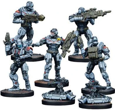 Enforcer commanders lead from the front, lending their considerable combat proficiency to the cutting edge of a conflict along with a tactical expertise that can only be gained through the decades of experience and enhanced synapses Enforcers have access to. This set contains 7 Hard Plastic and Metal Infantry for Warpath, including: 5 Hard Plastic and Metal Enforcers and 2 Metal Sentry Guns Commander with open helmet Medic with Medipack Sniper with Sniper Rifle Specialist with Fusion Gun Engineer with battlefield tools and 2 Sentry Guns Optional Rifles, Pistols, and Wristblades Optional Incinerator, Burst Laser, and Energy Gauntlet 25mm Plastic Round Bases Miniatures supplied unassembled and unpainted. Requires Superglue.