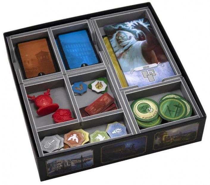 Insert compatible with 7 Wonders Duel® and expansions. The design provides both efficient storage and improved game play. The trays can be utilised during the game, and they greatly aid set-up and clear-away times. The rules and boards act as a lid on top of the trays.