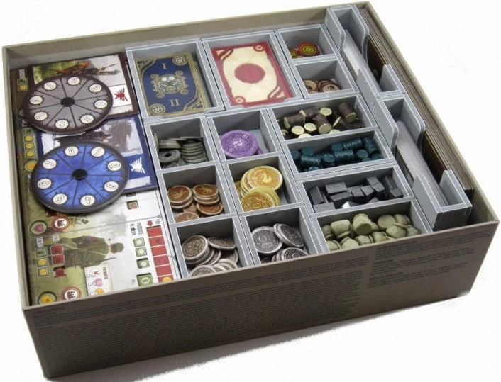 This insert is designed to be compatible with Scythe®, and the Invaders from Afar® expansion.The design provides both efficient storage and improved game play. Many of the trays can be utilised during the game, and they greatly aid set-up and clear-away times. The rules act as a lid on top of the trays.