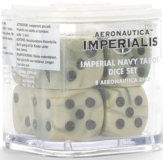 The eight dice in this set each measure 16mm x 16mm and feature an Aeronautica Imperialis icon on the 6 face. The dice are supplied in a clear plastic dice cube.