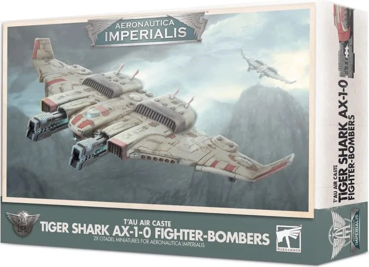 – 2 plastic T’au Air Caste Tiger Shark AX-1-0 miniatures, armed with either paired heavy rail cannons or paired heavy plasma accelerators