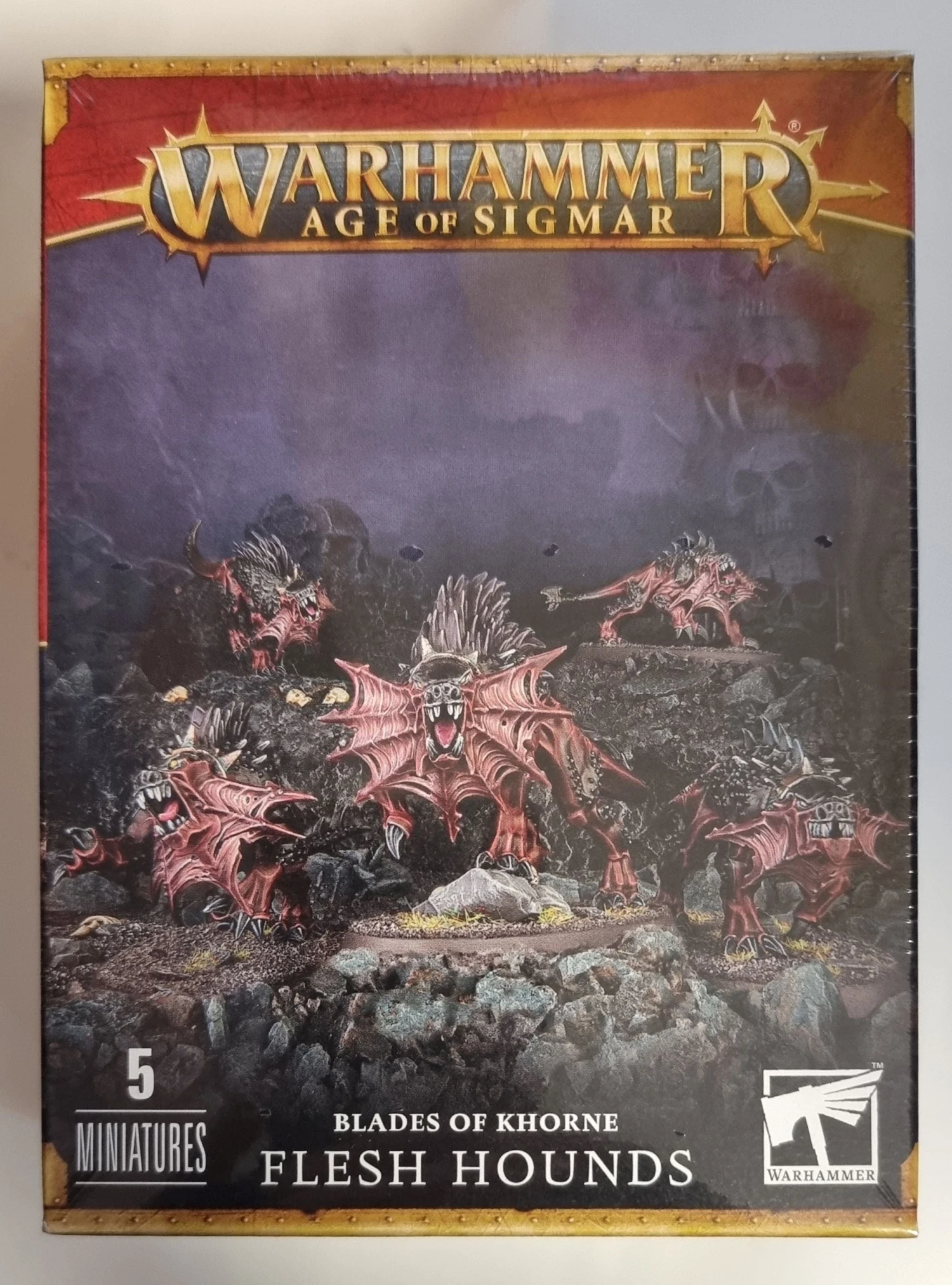 This kit contains everything you need to build five Flesh Hounds. Each is armed with blood-dark claws and wears a collar of Khorne.