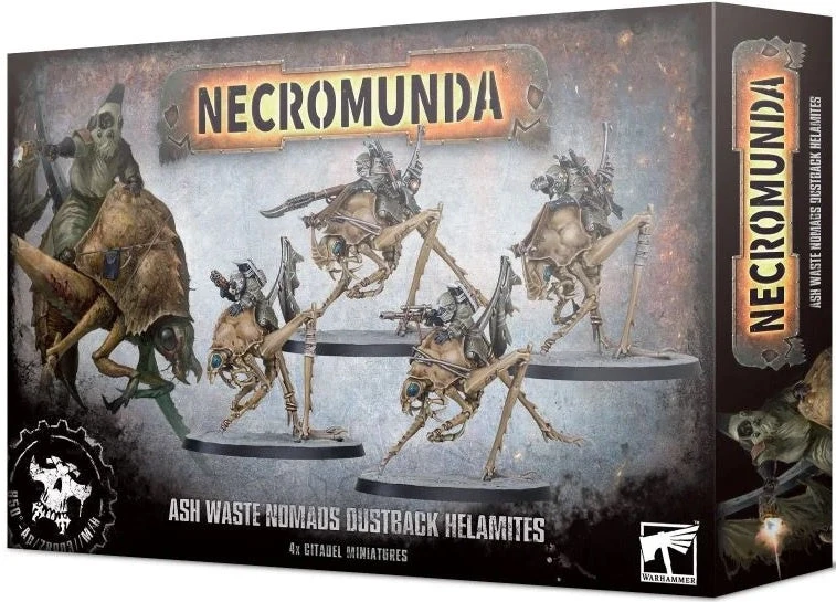 This multipart plastic kit allows you to add Dustback Helamite Riders to your Ash Waste Nomads gang. This set of four miniatures offers a number of equipment options and cosmetic components, to help you build unique mounted gangers, and includes: