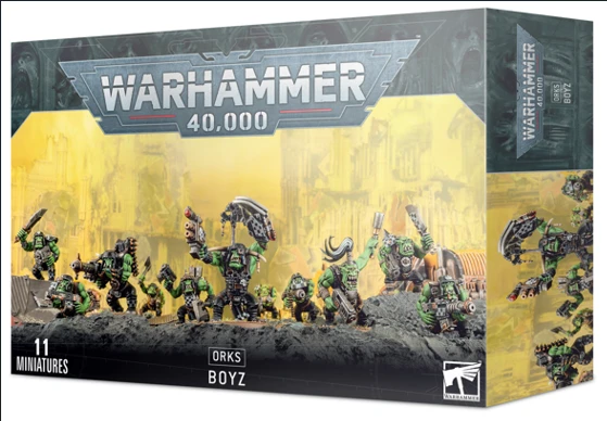 This boxed set contains 11 multi-part plastic Ork Boyz, and includes options for sluggas, choppas, shootas, heavy weapons and stikk bombz. Models supplied with 32 mm round bases. 50-10