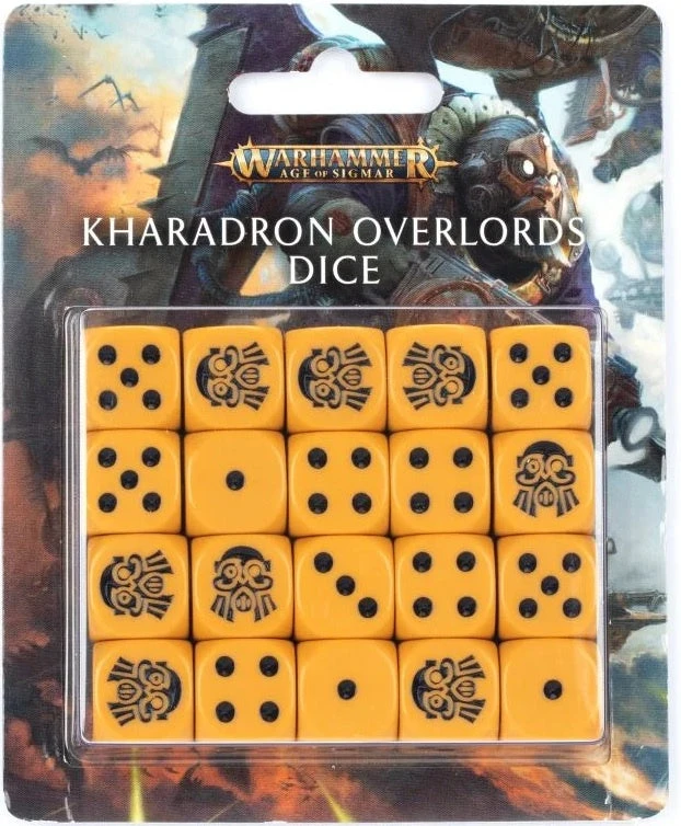 This set includes 20 six-sided, round-edged dice that measure 16mm along each edge. They are cast in a warm, brassy orange with black ink and feature the Kharadron Overlords icon on each 6 face.