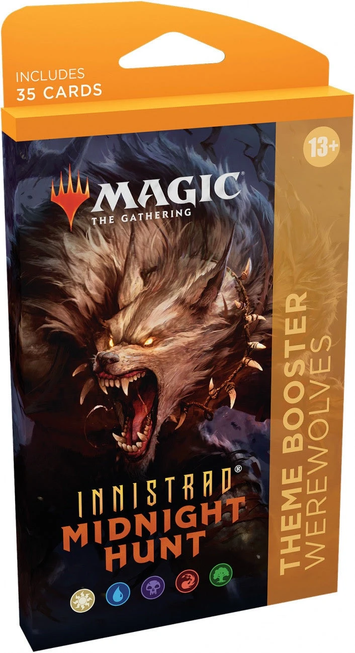 Each Innistrad: Midnight Hunt Theme Booster contains 1–2 rare or mythic rare cards and a combined total of 33–34 common and uncommon cards—plus 10% of Theme Boosters contain a Booster Fun variant!