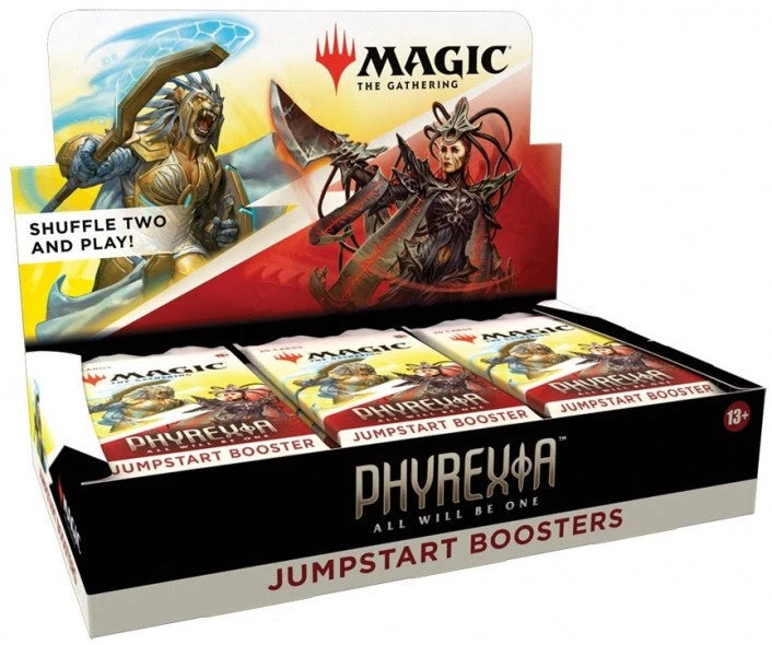 The Phyrexia: All Will Be One Jumpstart Booster Box contains 18 Phyrexia: All Will Be One Jumpstart Boosters. Each booster has a theme. Just grab two packs and shuffle them together for wild combos and a unique gameplay experience thats great for a quick game, for long-time fans looking to jump back in, or for a fun, simple way to learn the game.
