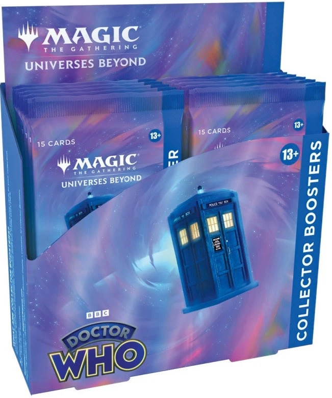 This Doctor Who Collector Booster Box contains 12 Doctor Who Collector Boosters. Each booster contains 15 Magic: The Gathering cards, with a total of 12 foil cards (3–10 Surge Foils and 2–9 Rainbow Foils) and 1 Surge Foil or Traditional Foil double-sided token. Every pack includes a combination of 7–14 cards of rarity Rare or higher and up to 7 Uncommon, up to 5 Common, and 1 Land cards.Â