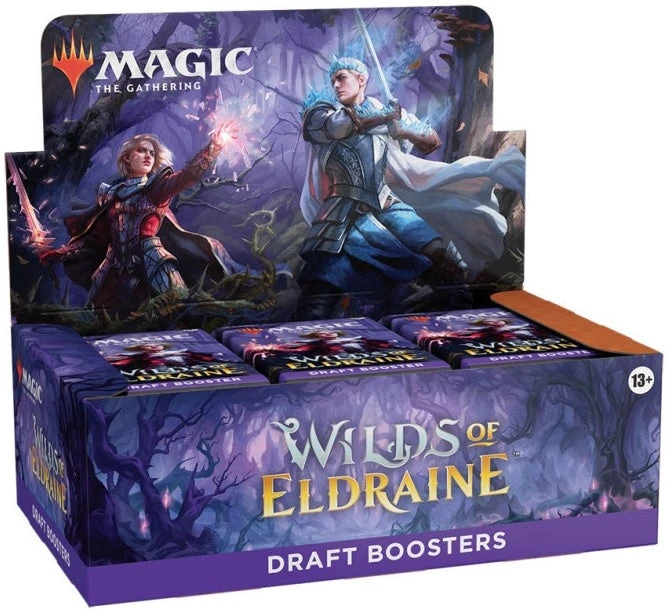 Your next adventure awaits! This Wilds of Eldraine Draft Booster Box contains 36 Wilds of Eldraine Draft Boosters. Each Draft Booster contains 15 cards and 1 token/ad card, including 1–2 cards of rarity Rare or higher, 3–4 Uncommon, 9 Common, and 1 Land cards (Full-Art Land in 33% of boosters). Every pack contains at least 1 special Borderless card of rarity Uncommon or higher and a Traditional Foil card of any rarity replaces a Common in 33% of boosters.