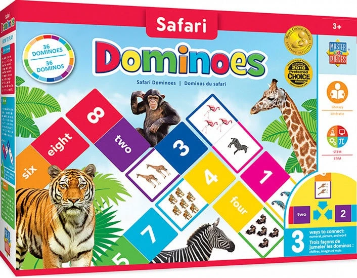 Safari Dominoes is a fun game for kids ages 3 and up. Kids can match dominoes three ways: numbers, pictures, words. Each number set is color coded to help the younger players identify matches. Educational domino play style helps develop skills in matching, counting, literacy and organizational skills. Allows for 2+ Players.