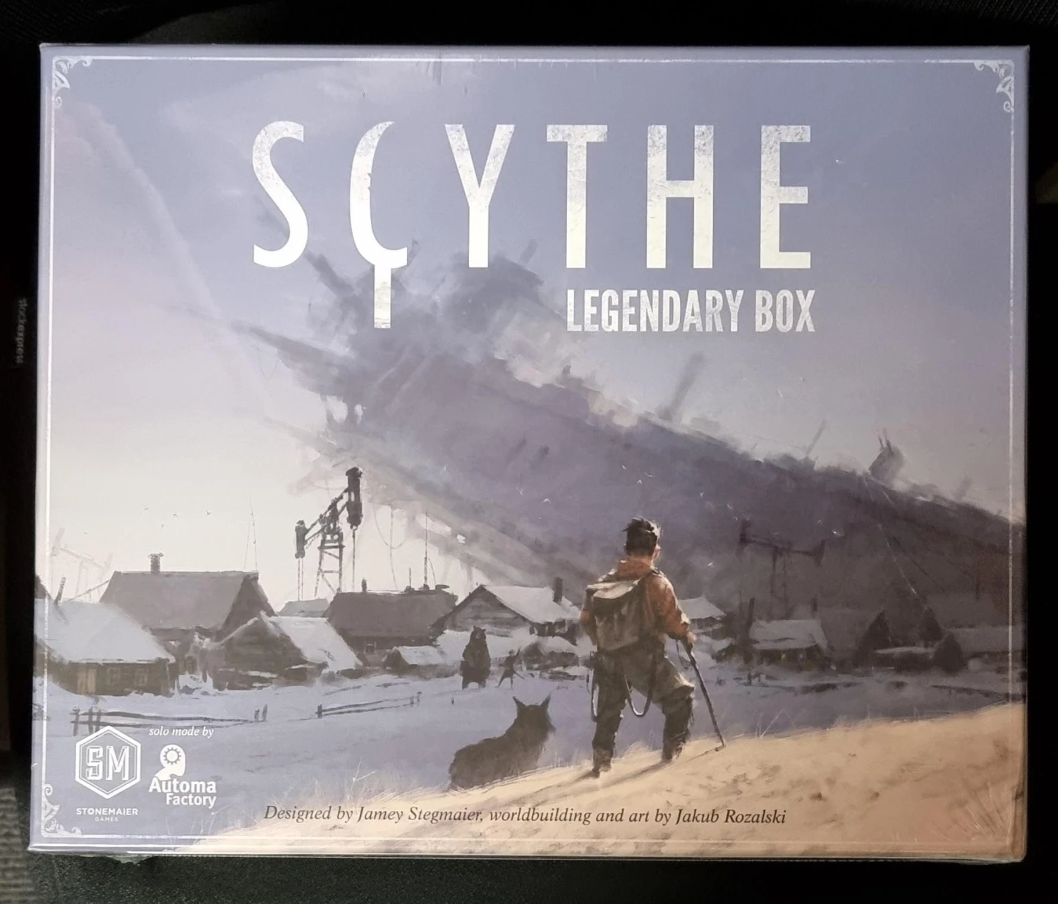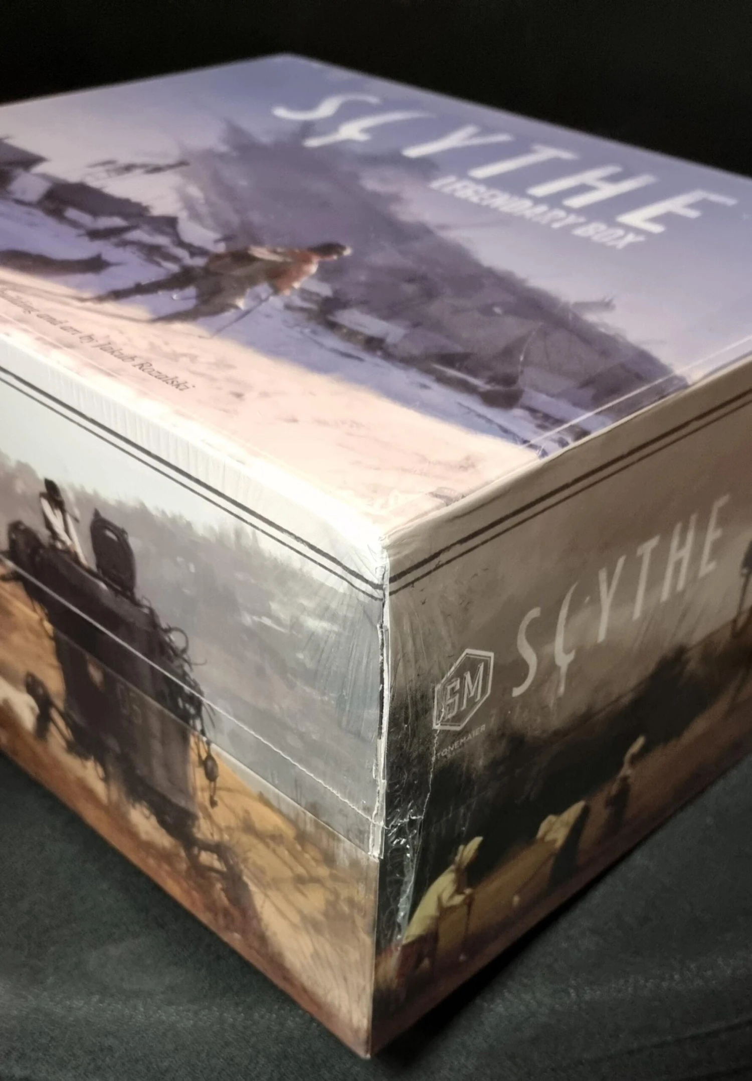 The Scythe Legendary Box is designed to hold the Scythe core game plus all expansions (present and future), accessories, and promos. It features a dual-layered bottom half and a top that is the exact same dimensions as all other Scythe tops, allowing backers and fans of the original top to use it interchangeably with the new top.