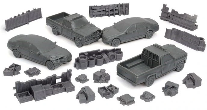 This set contains 12 detailed urban scenery pieces that can be arranged to provide plenty of cover for use in any tabletop game, such as post-apocalyptic, super hero or World War II.